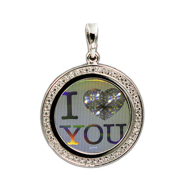 The "I ♥ You" Pendant is a simple and iconic look for those who are straightforward and like to get their point across quicky, or do not have particularly perceptive partners. The design is simple, yet bold, consisting of a large " I ♥ You" in the center. In the background is a pattern of hundreds of tiny hearts that sparkle in the light. The large heart sparkles due to the diffractive elements, a result of the latest nanotechnology. This piece can also last for centuries, and withstand extreme temperatures. The medallion is centered in a high-quality sterling silver pendant that complements the look.