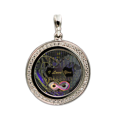 This piece contains the phrase "I love you" in every language. It is nano inscribed using precise lasers and the latest nanotechnology. It sparkles in the light due to its diffractive elements creating a gorgeous look, also enhanced by the gleaming high-quality sterling silver pendant. It features many hearts around the phrase "I love you", which is also above an infinity sign, which symbolizes the sturdy medallion, which can last for thousands of years and extreme temperatures. Behind the hearts are the pages of the phrase inscribed in every known language.